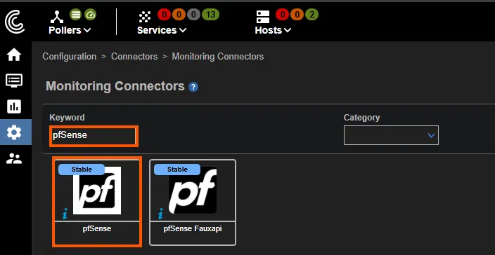 La dernière étape consiste à créer notre firewall dans la configuration de Centreon. Cette solution de supervision propose un template d’hôte pfSense que nous allons installer via : Configuration -> Connectors -> Monitoring Connectors. Ce connecteur se nomme simplement pfSense.