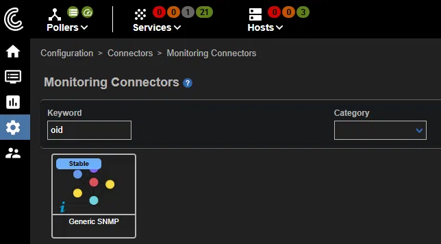 Pour superviser un hôte à partir d’un OID spécifique, il est nécessaire de créer un service personnalisé dans Centreon. Pour cela, on utilise le connecteur “Generic SNMP”, accessible depuis le menu suivant : Configuration → Connectors → Monitoring Connectors.