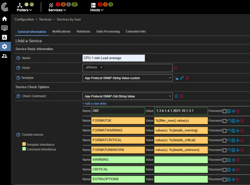 Dans Centreon, nous avons créé un service nommé « CPU 1 min Load average » afin d’identifier clairement la période de charge supervisée. L’équipement ciblé par cette supervision est notre pfSense, mais cela peut tout aussi bien être un serveur ou tout autre équipement compatible SNMP. Pour ce service, nous utilisons le template « App-Protocol-SNMP-String-Value-custom », qui permet de définir une requête SNMP personnalisée basée sur une chaîne de caractères. La commande de vérification choisie est « App-Protocol-SNMP-Oid-String-Value », qui interroge une valeur spécifique à partir de l’OID renseigné.