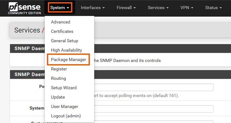 Pour installer le paquet NET-SNMP sur pfSense, allez dans le menu System puis sélectionnez Package Manager.