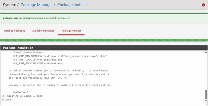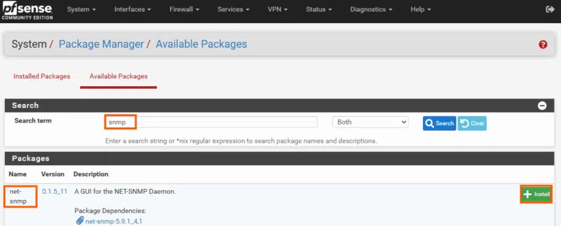 Dans la section Available Packages nous allons installer net-snmp qui va nous permettre de pouvoir superviser notre pfSense de manière sécurisée avec SNMPv3.