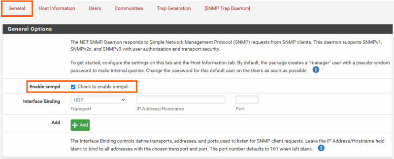 Dans l’onglet Général activez le service snmpd et validez le changement.