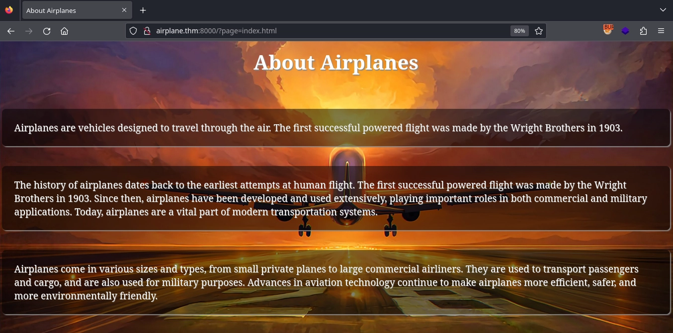When visiting http://airplane.thm:8000/, we get redirected to http://airplane.thm:8000/?page=index.html. It displays a static page about airplanes.