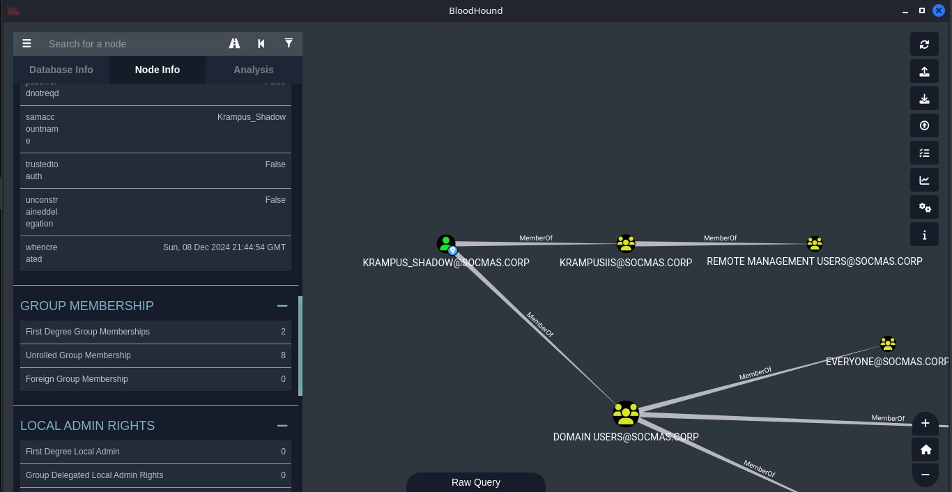 Uploading the collected data to BloodHound and checking the rights our users have, we can see that the Krampus_Debugger has a GenericWrite right over the Krampus_Shadow user.