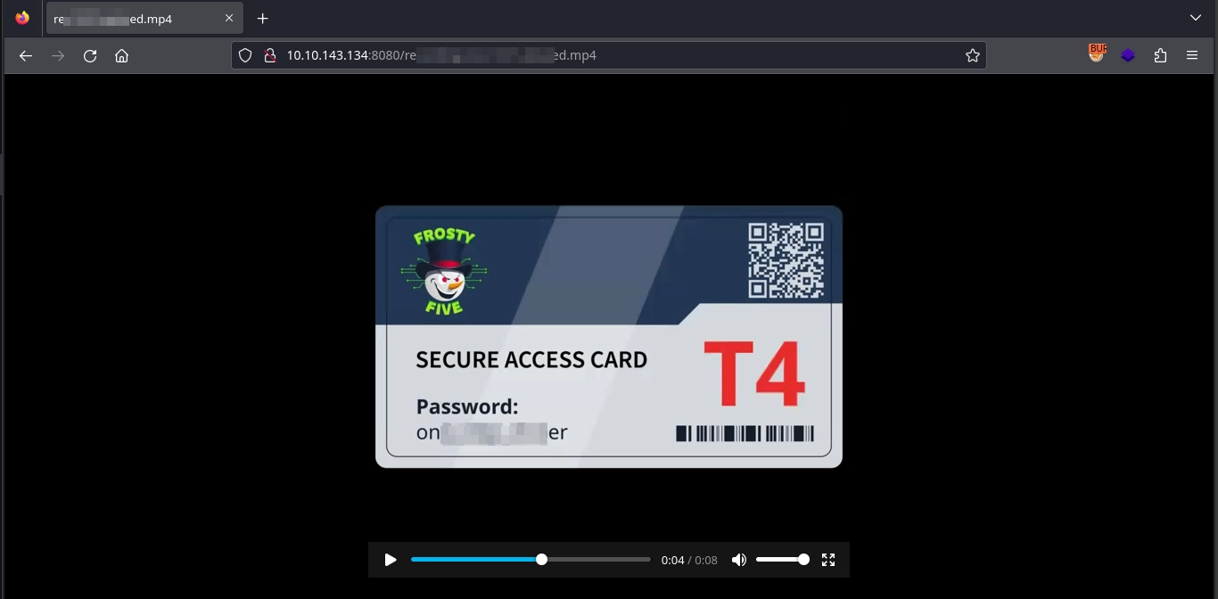 From the output of the recordings table, we can see the path for the deleted recordings is set as /re[REDACTED]ed.mp4. Visiting this video on the CCTV web server, a couple of seconds in, we can find the keycard with the password on it being on[REDACTED]er.