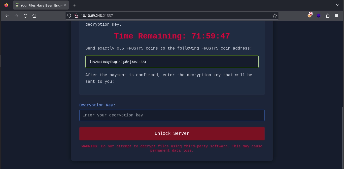 Visiting port 21337 on both servers, we encounter the same web application prompting us for a decryption key to unlock the server.