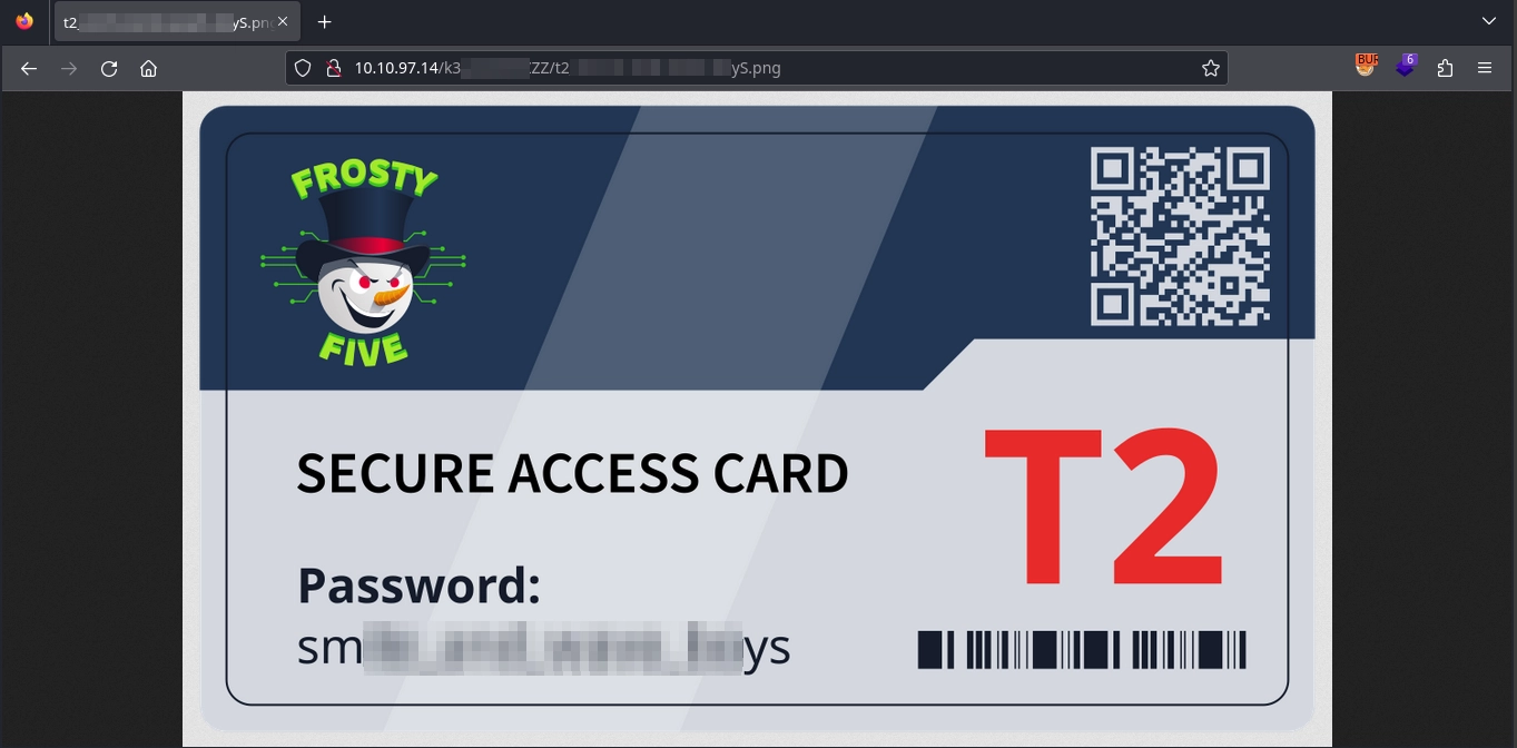 Finally, by visiting the endpoint /k3[REDACTED]ZZ/t2[REDACTED]yS.png on port 80, we locate the keycard, which contains the password: sm[REDACTED]ys.