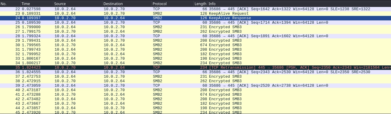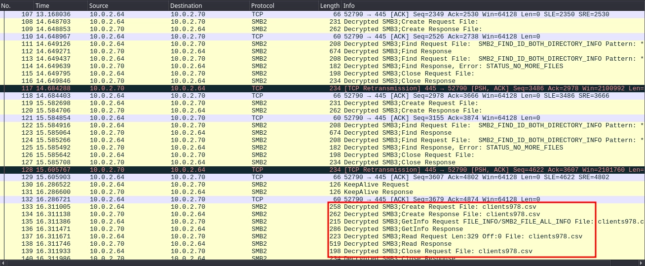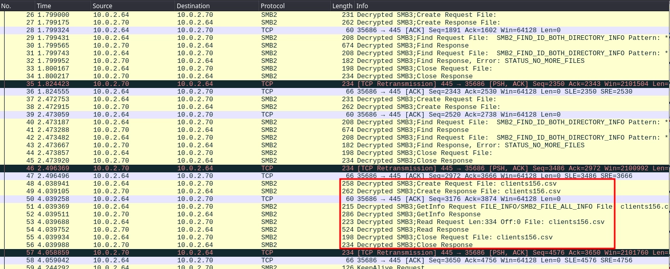 After adding the session key, we can see that the SMB3 traffic is now decrypted. We also see the user accessing the clients156.csv file.