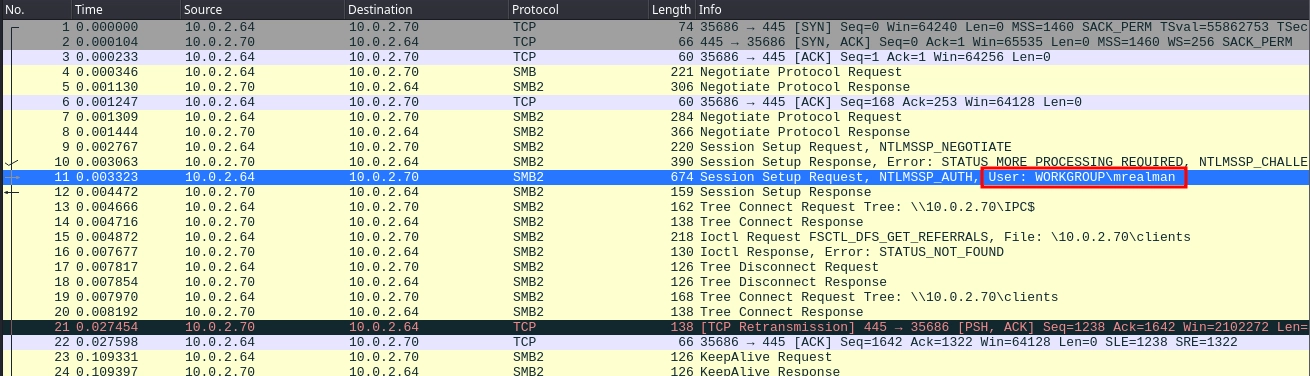 Looking at the traffic manually, first we see a login for the user mrealman.