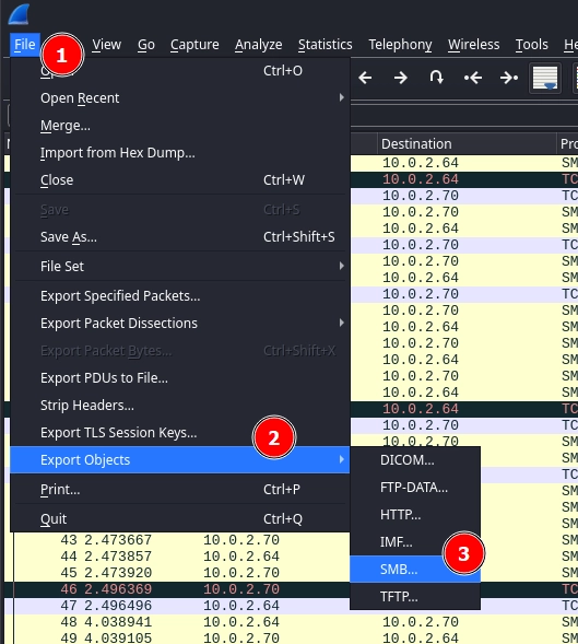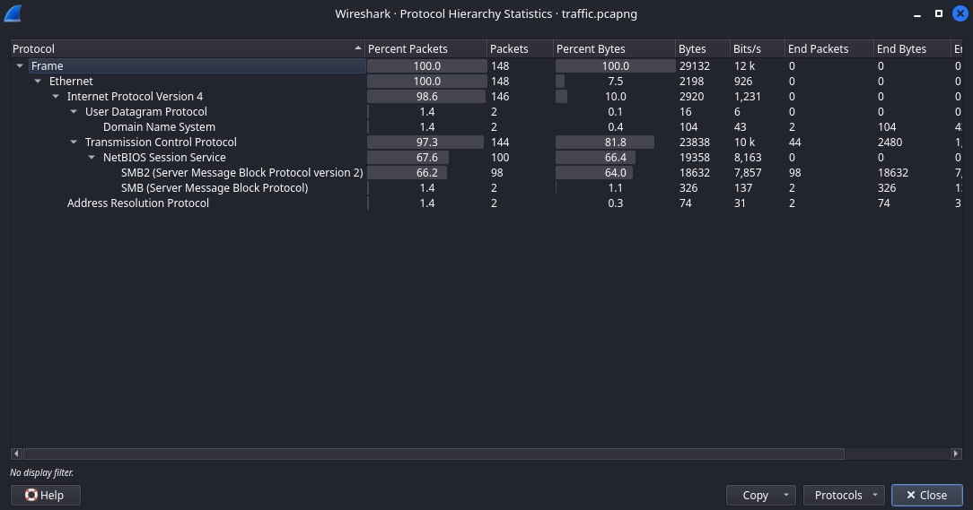 Opening the traffic.pcapng file in Wireshark and checking the statistics, we see that it mainly includes SMB traffic.