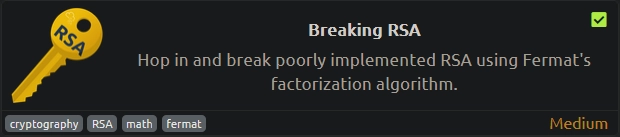 Breaking RSA was a simple room about RSA, where we discover a public key on a web server along with a note stating the key is weak due to factors for modulus chosen to be numerically close. Using Fermat’s factorization method to factorize the modulus from the public key, we were able to calculate the private exponent and construct the private key. Using this private key with SSH, we were able to get a shell as root.