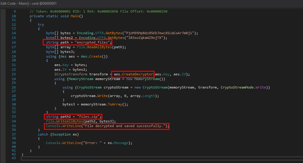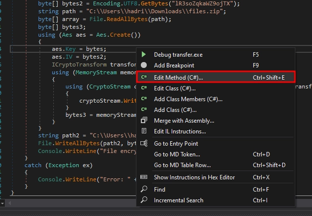 Since dnSpy allows us to modify .NET assemblies easily, we can modify it to perform decryption instead of encryption.