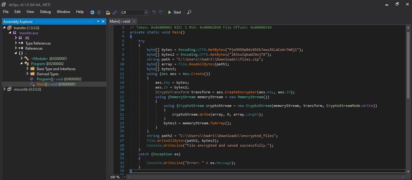 Since transfer.exe is .NET assembly, I will use dnSpy to analyze it.