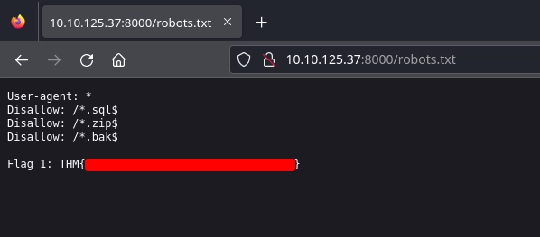 Checking the robots.txt, we get a couple of disallowed extensions and get the first flag.