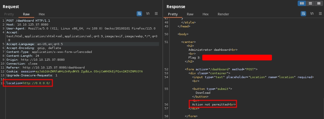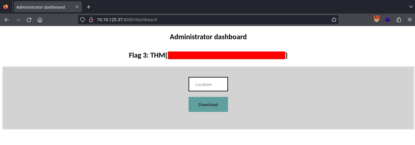 After logging in with the new password at the /administrator endpoint, we get the third flag in /dashboard.