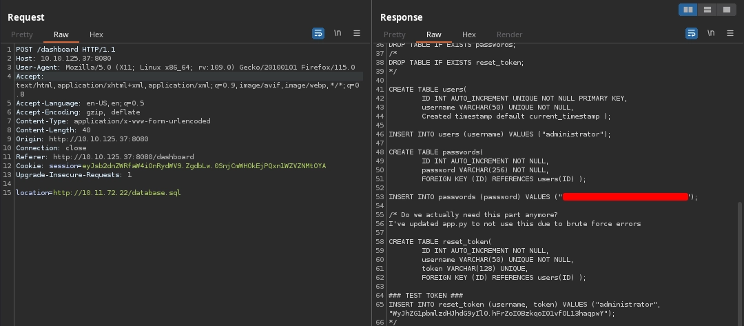 /administrator: The login page, upon logging in, redirects to/dasboard./forgot_password: Given a username with aPOSTrequest, it generates a token and updates the database with it./password_reset: Currently, it only compares the user-given token to one from the database.