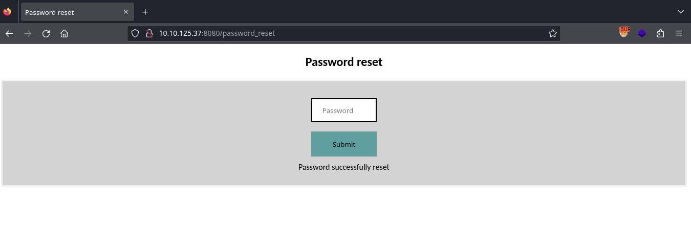 Using the found token, we can reset the password for the administrator user with a request to http://10.10.125.37:8080/password_reset?token=fbf8a350e9f8348752f8c48d2500e7703ebc945c endpoint.