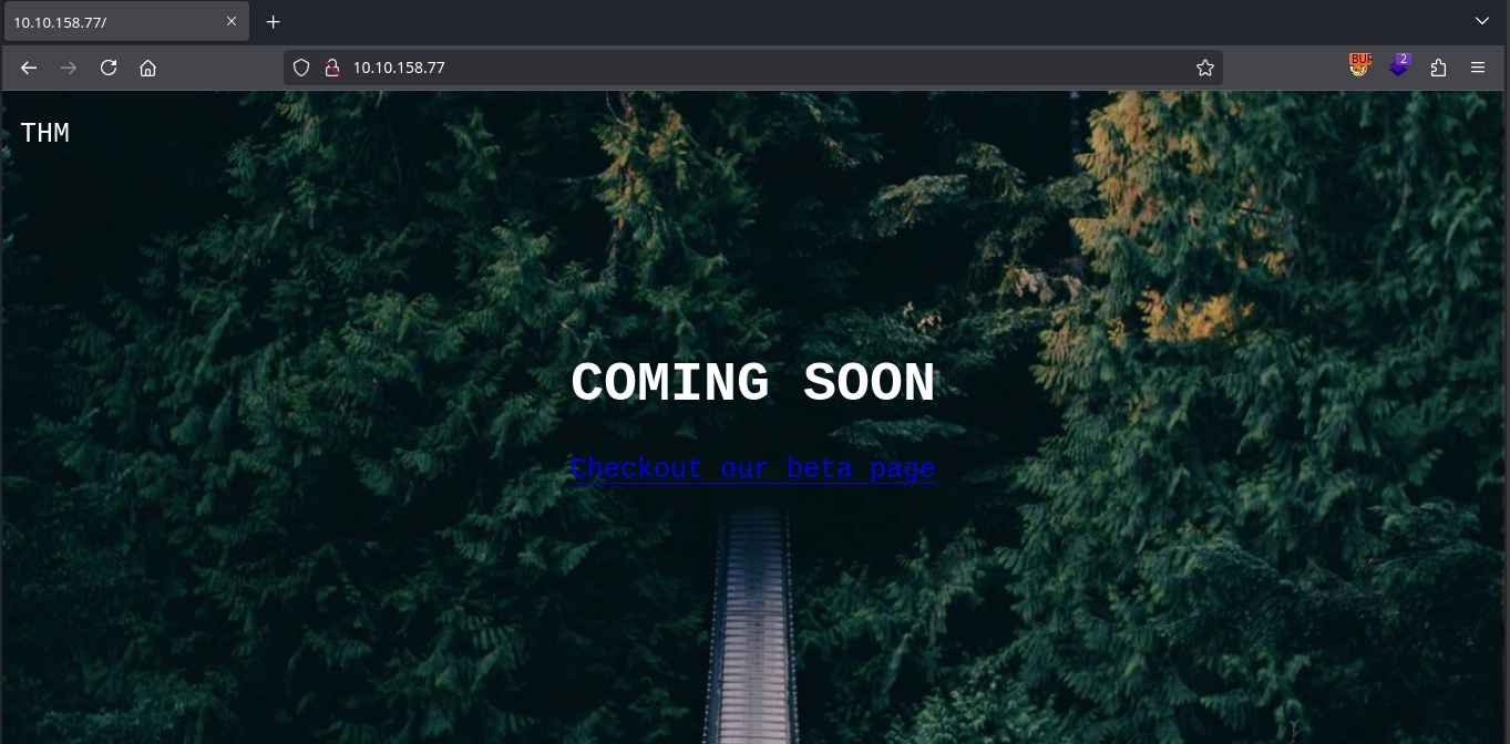 Visiting http://10.10.158.77/, we see a static “coming soon” page with a link to /page/home.html.