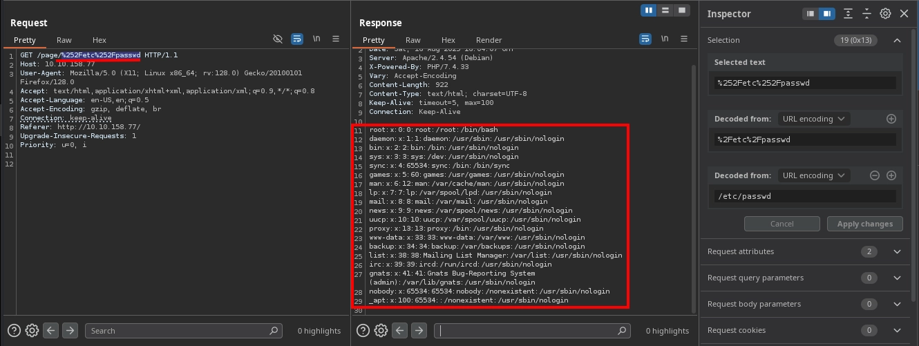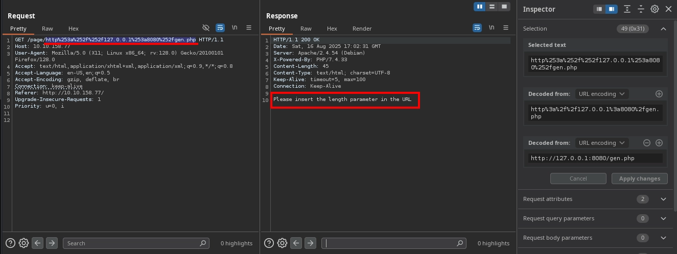 At this point, we have not uncovered much, but by combining our findings, we can make assumptions about how the application operates. It appears that we are interacting with a frontend Apache2 server and when the URL starts with /page/, the server extracts the content after it and proxies the request to a backend Apache2 server with the gen.php and index.php files as http://backend:8080/index.php?page=*, which stops us from directly accessing the gen.php on the backend.