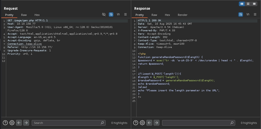 Examining /page/gen.php, we find a simple PHP script that accepts a length parameter via POST and passes it to the exec function, leading to a command injection vulnerability.