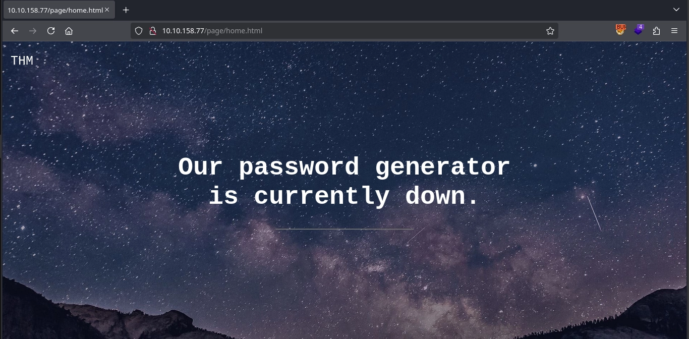 Visiting http://10.10.158.77/page/home.html, we only see a message about a password generator being down and nothing else.