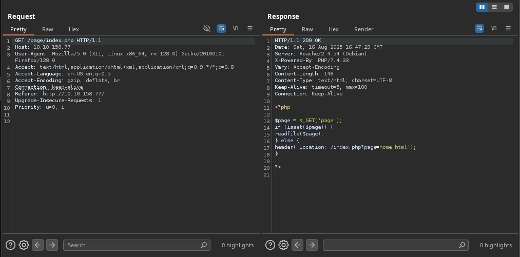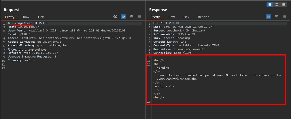 Checking one of these responses, we discover something peculiar: whatever we pass after /page/ in the URL seems to be passed to the readfile() function in /var/www/html/index.php.