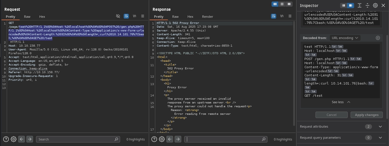 Essentially, Apache2 extracts anything after the /page/ and appends it to the http://backend:8080/index.php?page= request, and using this we are able to smuggle requests to the backend using the CRLF (\r\n) characters.