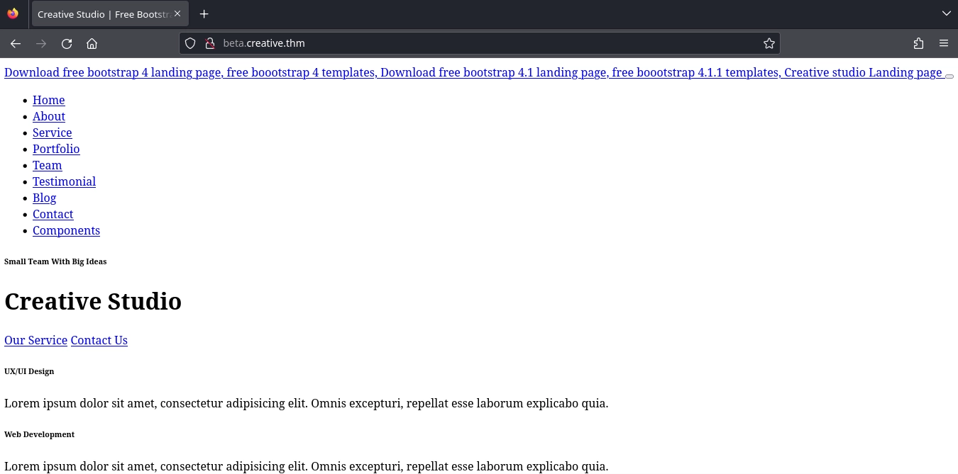 Fuzzing for the virtual hosts using ffuf, we discover http://beta.creative.thm.