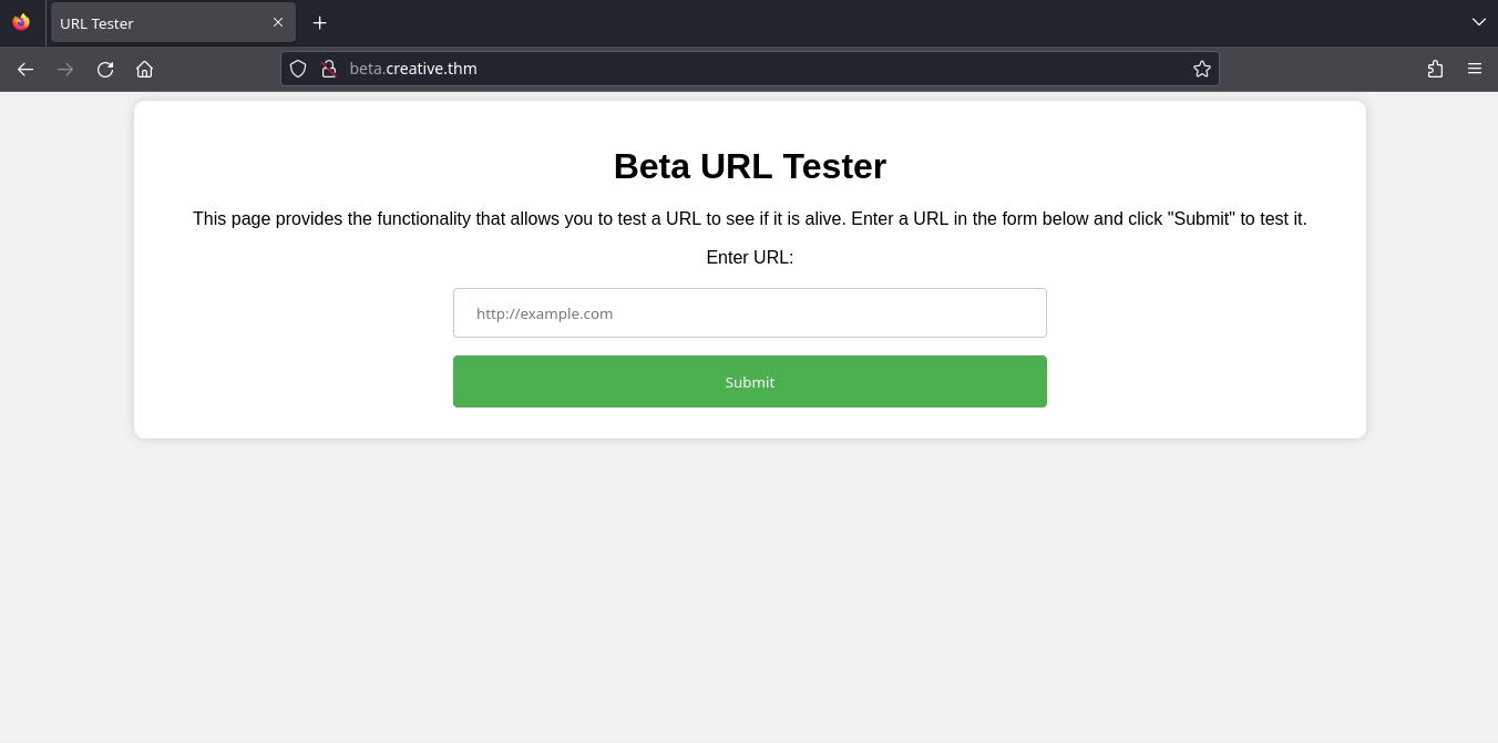 Visiting http://beta.creative.thm/, we see a form where we can submit URL’s for testing.