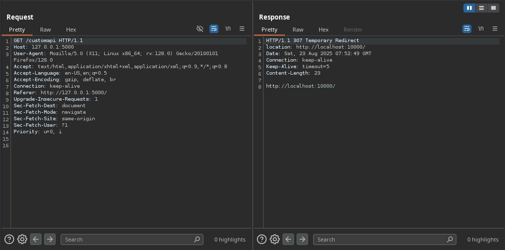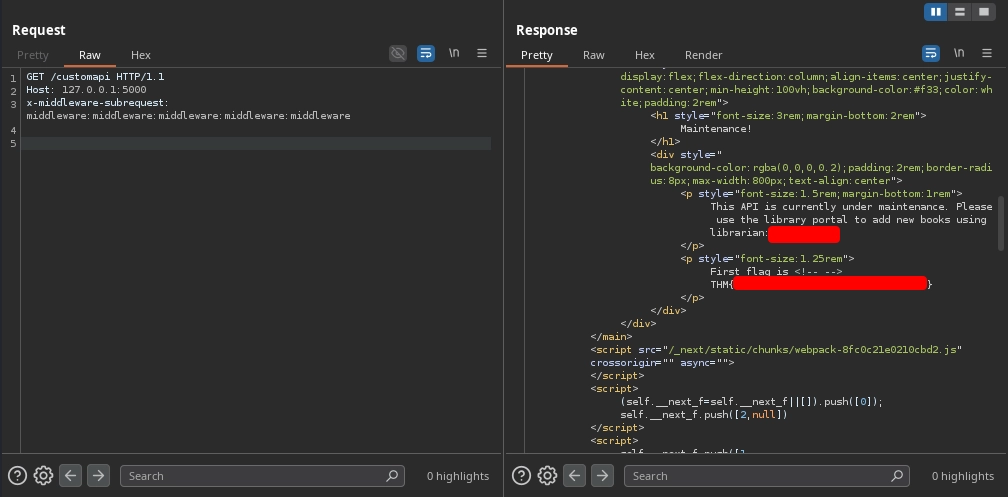 As we can see, making a request to /customapi with this header works and bypasses the middleware authentication, allowing us to discover the first flag along with a set of credentials.