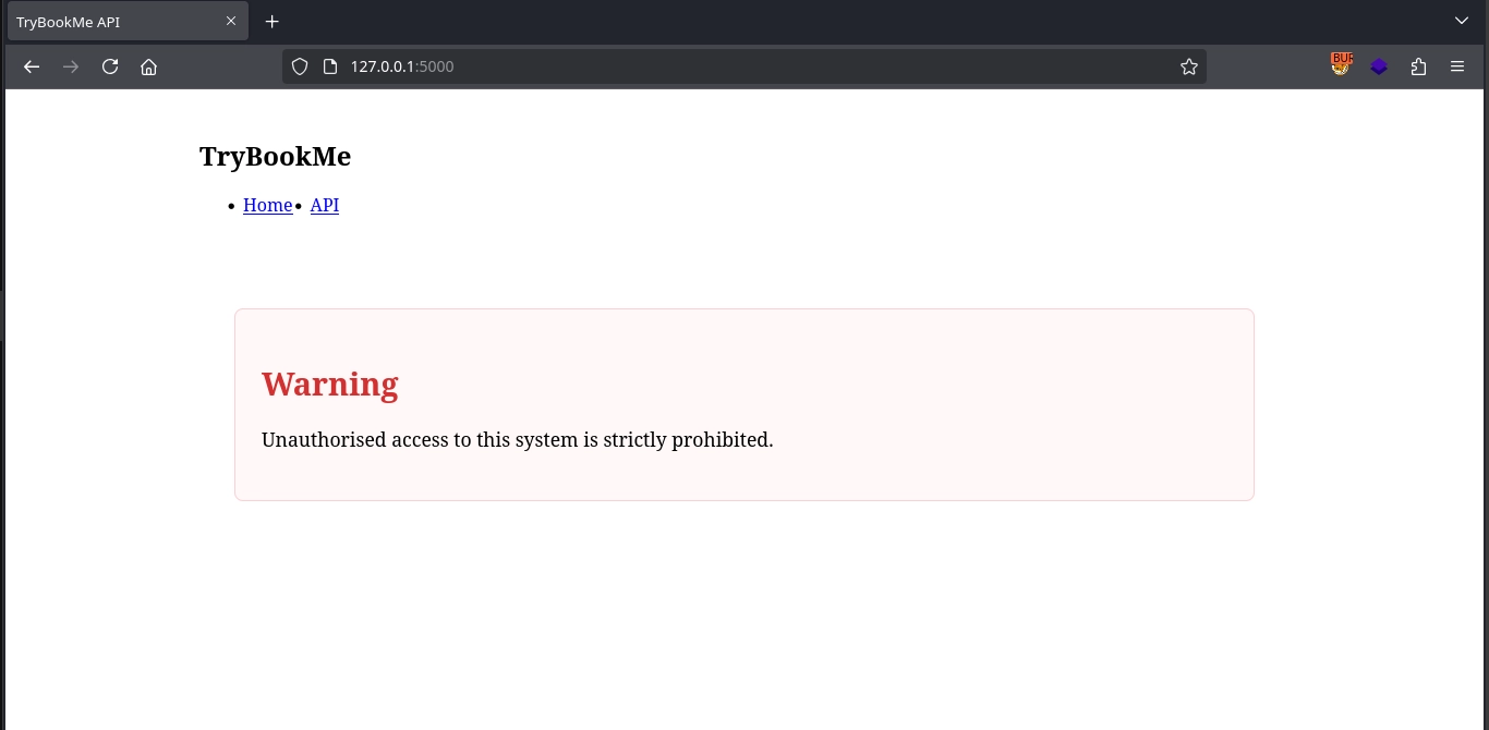 Now, by visiting http://127.0.0.1:5000/ in the browser, we can access http://127.0.0.1:10000/ normally; however, we only see the message “Unauthorised access to this system is strictly prohibited.”.
