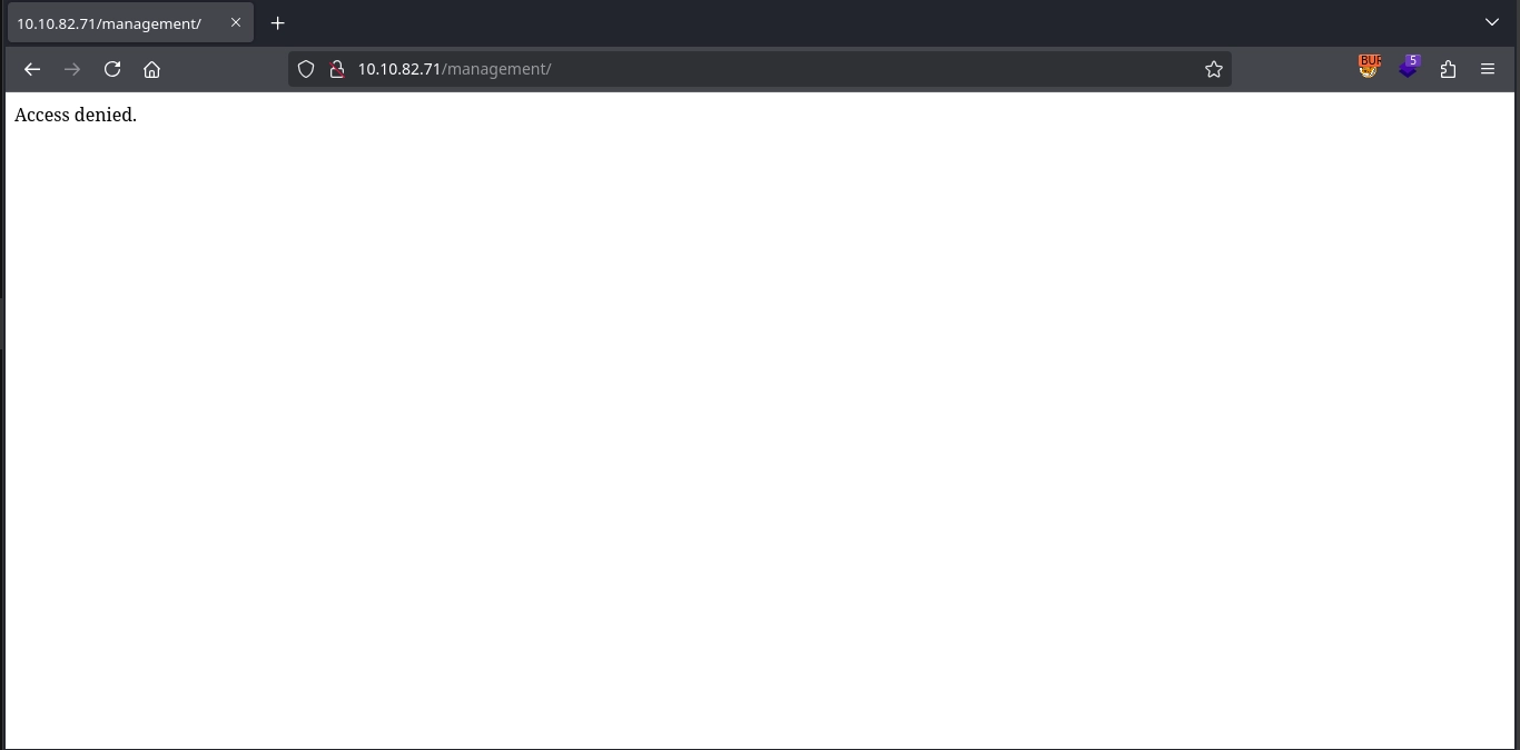 Visiting /management redirects us to /management/, where we only get an “Access denied.” message.