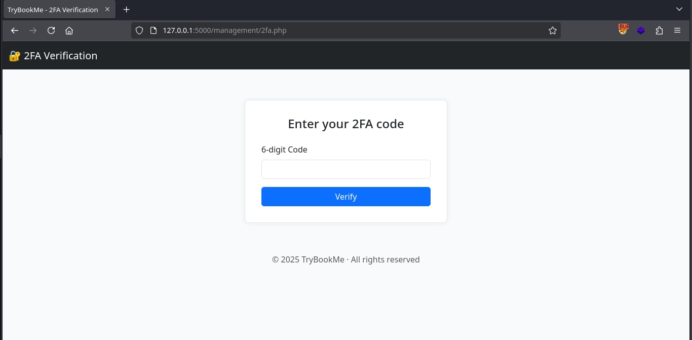 Logging in with the librarian:L[REDACTED]! credentials we discovered before, we get redirected to /management/2fa.php where the application asks for a 2FA code.