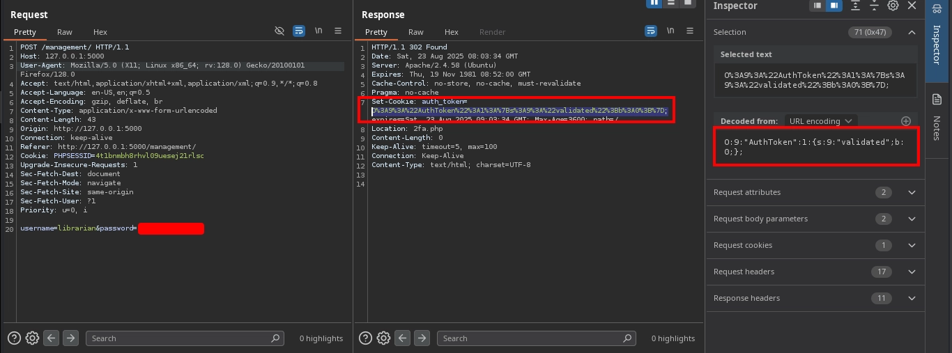 We don’t have the code, but checking the response to our login request, we can see the application setting the auth_token cookie as O:9:"AuthToken":1:{s:9:"validated";b:0;}, which looks like a serialized PHP object where the validated property (boolean) is set to false (0) in the AuthToken class.