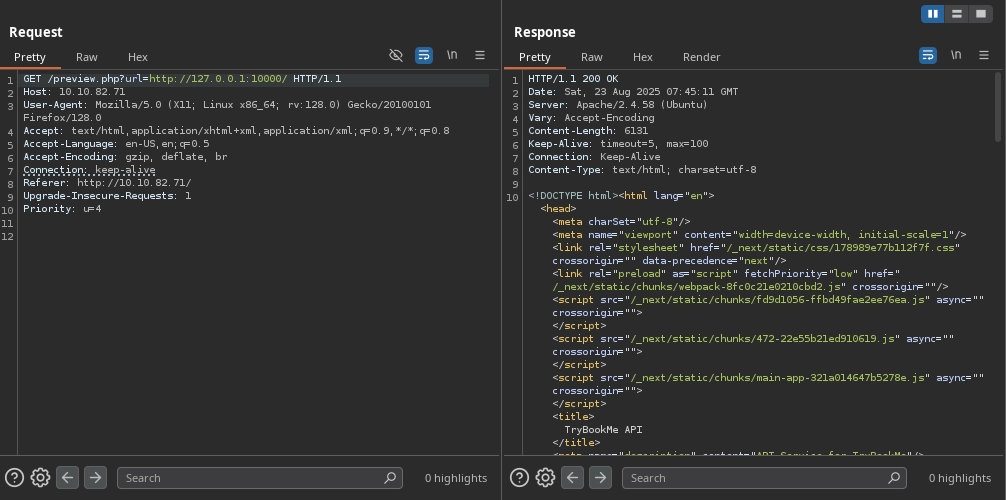 Requesting http://127.0.0.1:10000/ via /preview.php?url=http://127.0.0.1:10000/ shows a Next.js application: