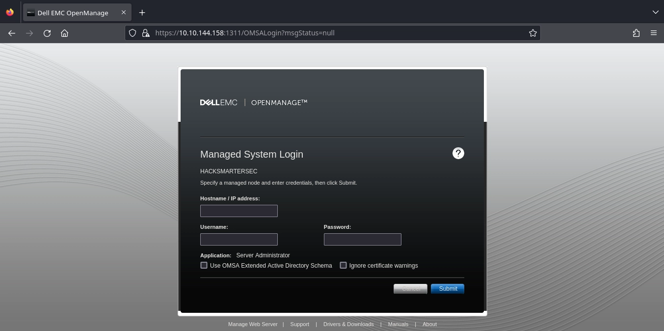 For the Hack Smarter Security room, we leveraged a file disclosure vulnerability in Dell OpenManage Server Administrator to obtain credentials and establish a SSH session. Subsequently, we hijacked a service binary to escalate privileges to Administrator.