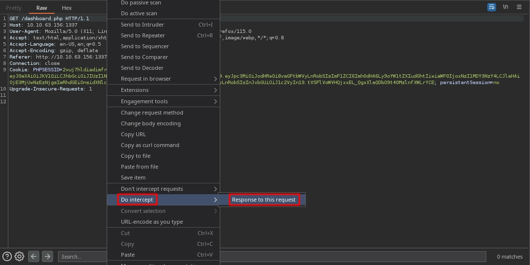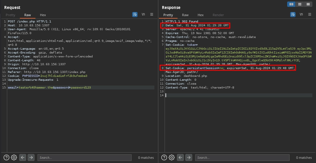 Well, the script we commented out was dealing with the persistentSession cookie, which is absent in our request to the http://10.10.63.156:1337/execute_command.php and looking at our login request, we can see why. While it sets this cookie for us, it sets it with a very short lifespan.