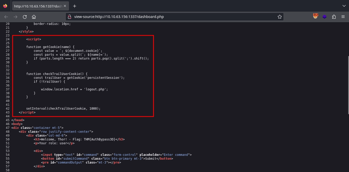 After gaining access to the dashboard, we see a form for running commands, but before we are able to run anything, we will be redirected back to http://10.10.63.156:1337/index.php. Checking the source code for http://10.10.63.156:1337/dashboard.php, we can see it is due to this script: