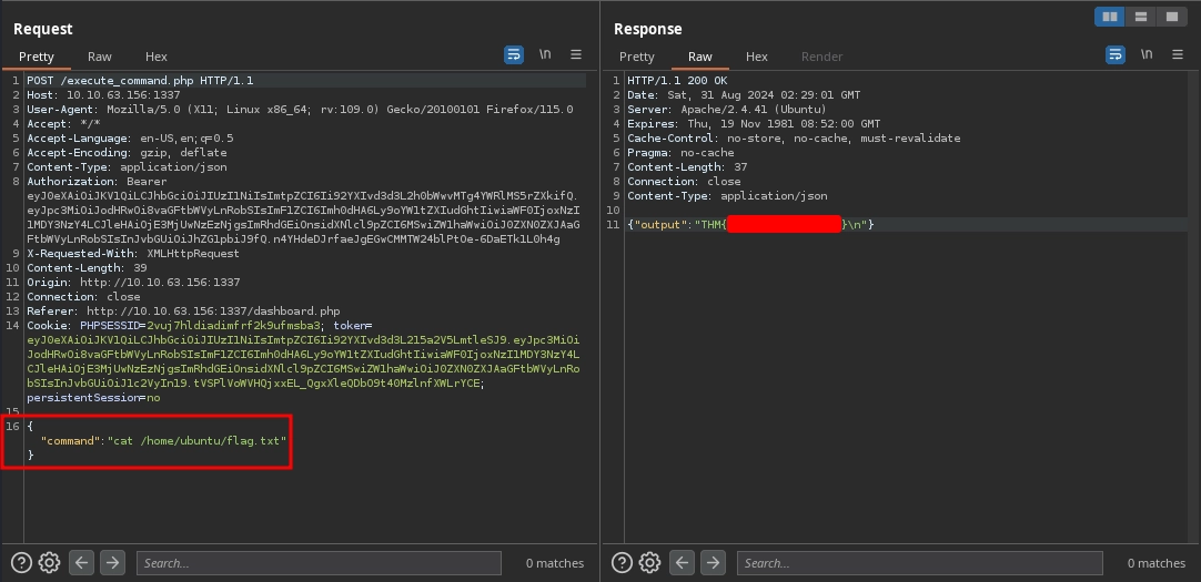 Using this token on the http://10.10.63.156:1337/execute_command.php endpoint, we are now able to execute commands other than the ls.