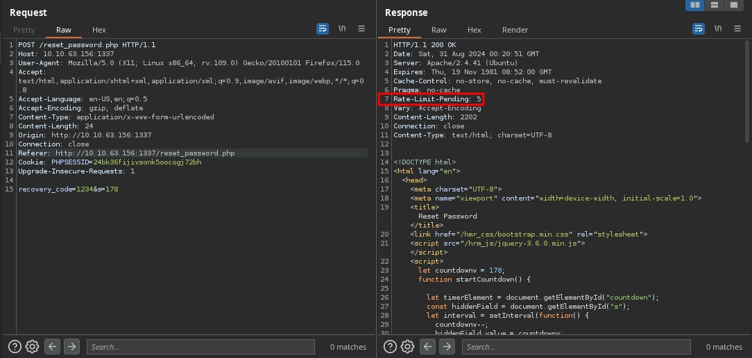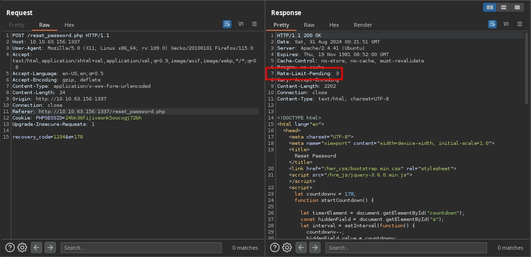Since it is only a 4-digit code, we should be able to brute-force it easily. However, if we attempt to do so, we will first notice the Rate-Limit-Pending header in the response.