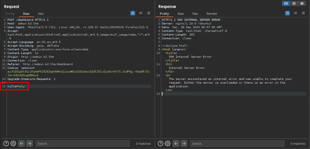 Testing it for SQL injection, we notice that adding a single quote (') to our input returns a 500 response, indicating a potential vulnerability.