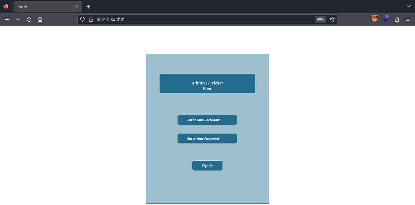 Upon visiting http://admin.k2.thm/, we see a login page for Admin IT Ticket View.