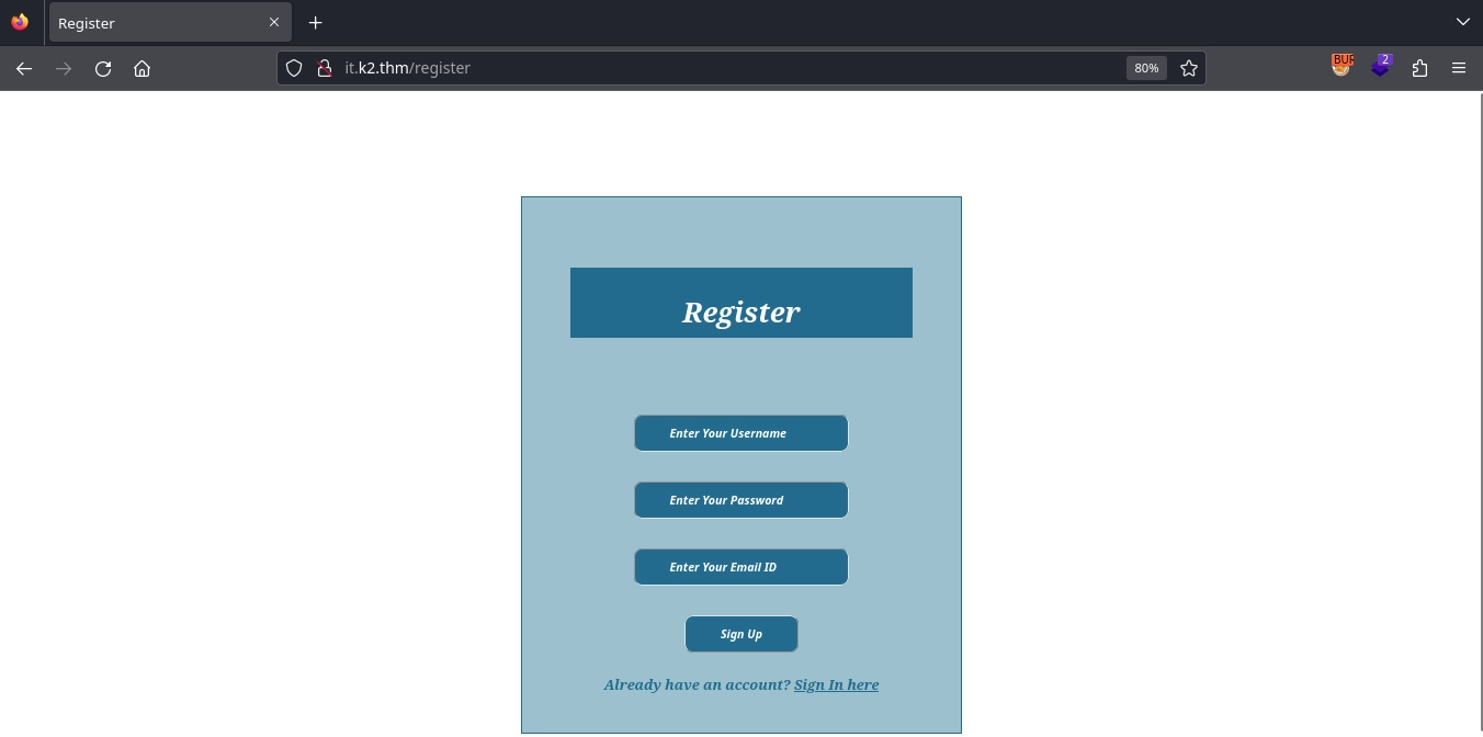 Clicking the Sign Up here button on http://it.k2.thm/, we are redirected to http://it.k2.thm/register, where we can register an account.