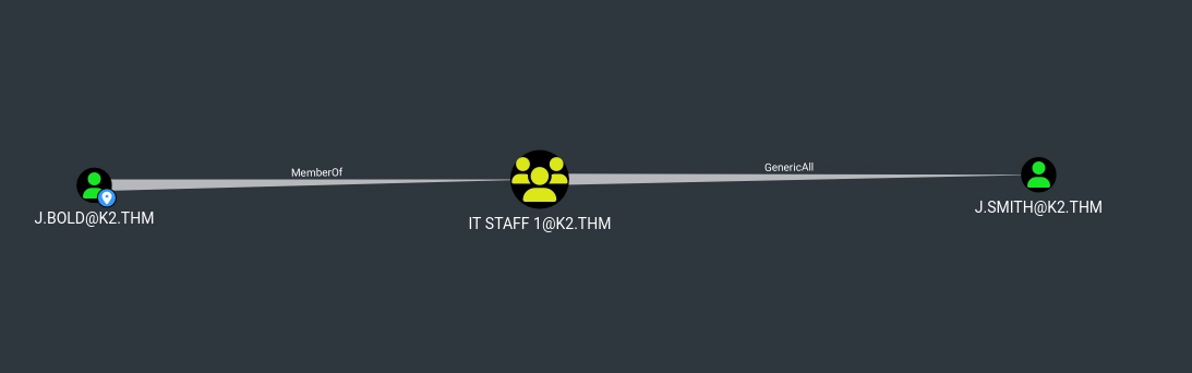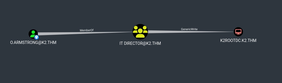 Examining our rights in BloodHound, we can see that the user o.armstrong is a member of the IT Director group, whose members have GenericWrite right over the K2ROOTDC.